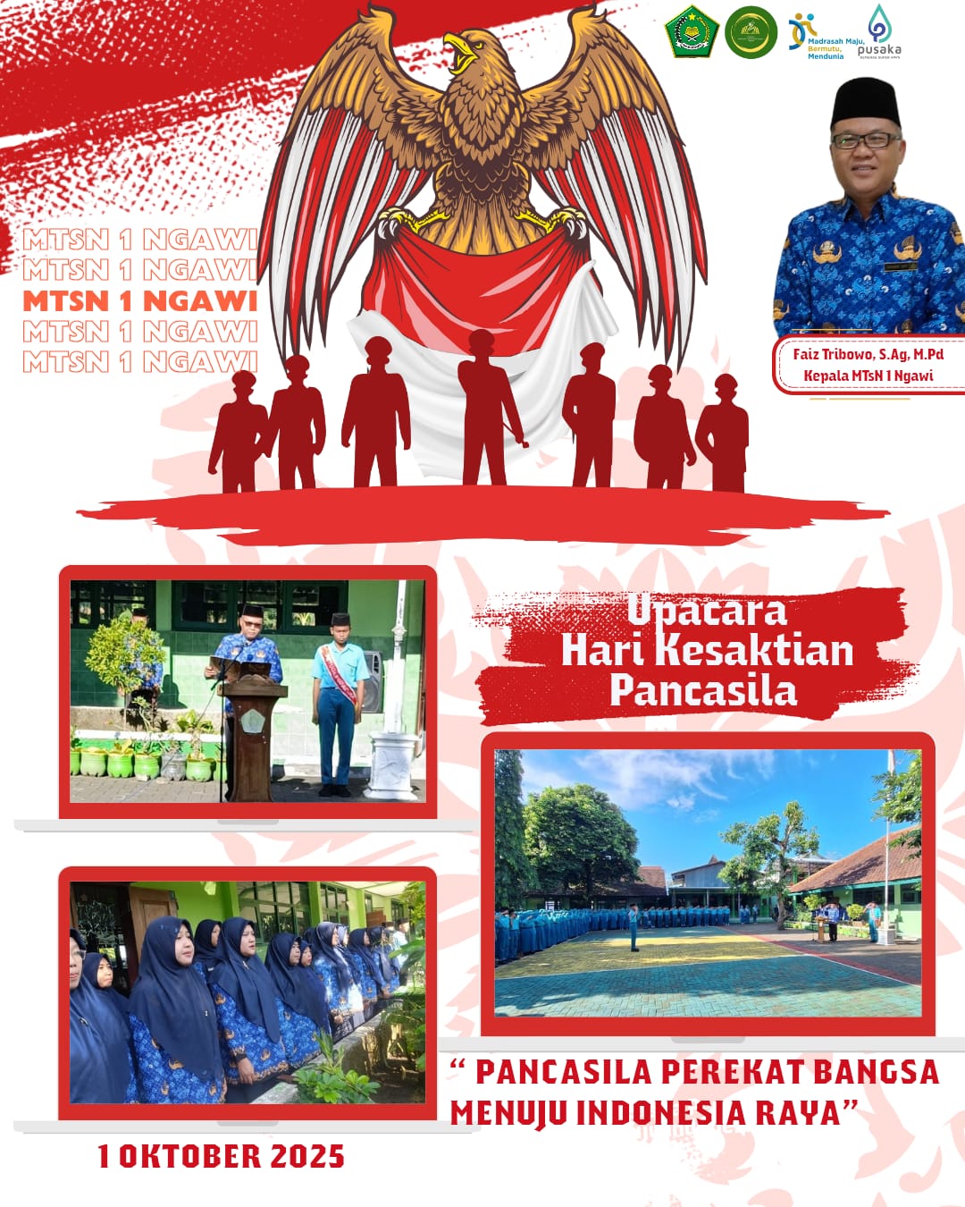 Di MTsN 1 Ngawi, peringatan Hari Kesaktian Pancasila tahun 2025 dilaksanakan dengan penuh khidmat dan semangat kebangsaan. Seluruh dewan guru, tenaga kependidikan, serta peserta didik mengikuti upacara bendera dengan mengenakan seragam rapi dan penuh kedisiplinan. Upacara yang berlangsung di halaman madrasah ini menjadi wujud nyata penghormatan terhadap para pahlawan yang telah berjuang mempertahankan ideologi bangsa.